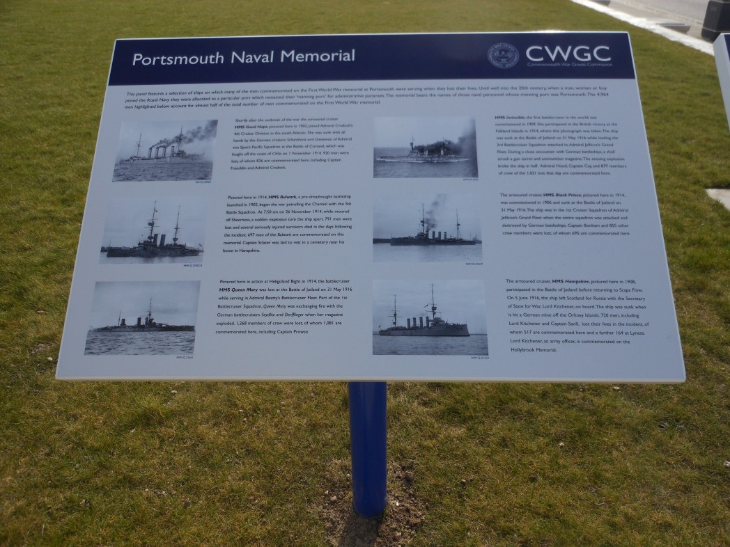 The Portsmouth Naval Memorial is the first of its kind to receive the CWGC panels. The panels provide information such as details of ships lost at sea. Almost 25 000 sailors from World Wars I and II are remembered, most of whom died at sea. The panels also feature a QR (Quick Response) code; if you scan this with a smart phone, you can obtain more information, such as biographies of some of those remembered.
